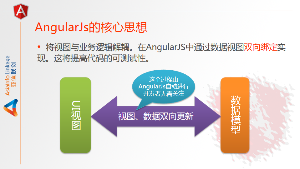 AngularJs的核心思想:将视图与业务逻辑解耦。在AngularJS中通过数据视图双向绑定实现。这将提高代码的可测试性。