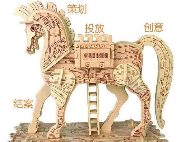 传统广告把广告活动的执行流程,分为策划、创意、投放和结案几个部分,譬如下面特洛伊木马的头尾身足。只是“投放”这个马身子,因为传统媒体既无法归因,也无法个性化,只好当个黑盒子不求甚解。