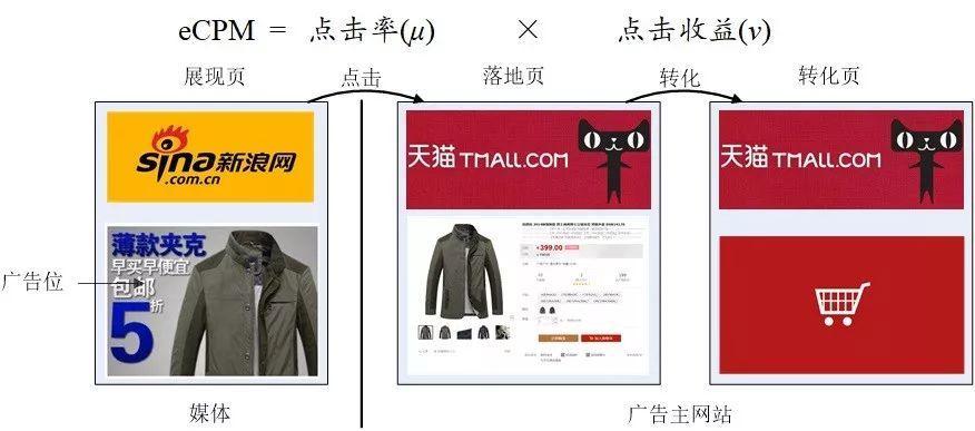 如下图所示,一部分用户看到广告后会点击它,这个比例是点击率μ;而点击用户又可能产生转化,为客户带来平均点击收益v。显然,只要分别算出这两个量,把它们乘起来就是eCPM。