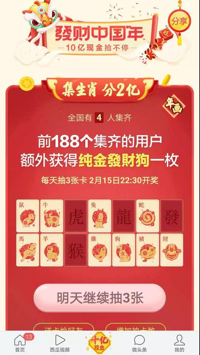 春节期间期间最多的就是集卡的活动,比如:支付宝的集福、百度、头条和抖音也都有做这类活动。