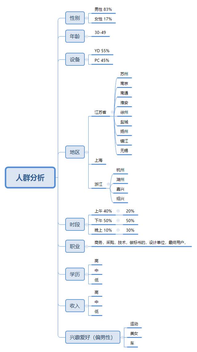 如果在某行业做了一年左右,大体上对人群也有个大概的了解,如果没有清晰的思路,可以用思维导图做出来。人群画像包括:性别,年龄,使用设备,推广地区,时间段,职业,学历,兴趣爱好等。我们对人群的了解越透彻,竞价推广越好做,举例: