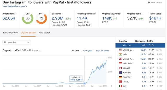 这是其中的一个案例,其实这个网站在2018年中旬就开始创建,但当时估计没怎么重视SEO,到了2019年开始重视SEO,并开始做大量的外链,现在搜索流量已经占到每月30多万。按最低客单价5美金来算,3%的转化率也能做到45000美金的收入,折合人民币也有30多万每个月。