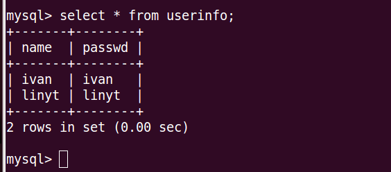 为了测试,需要往表里面插入数据。使用mysql语句往userinfo表插入两个用户信息,分别是linyt和ivan,密码和用户名内空一样。
