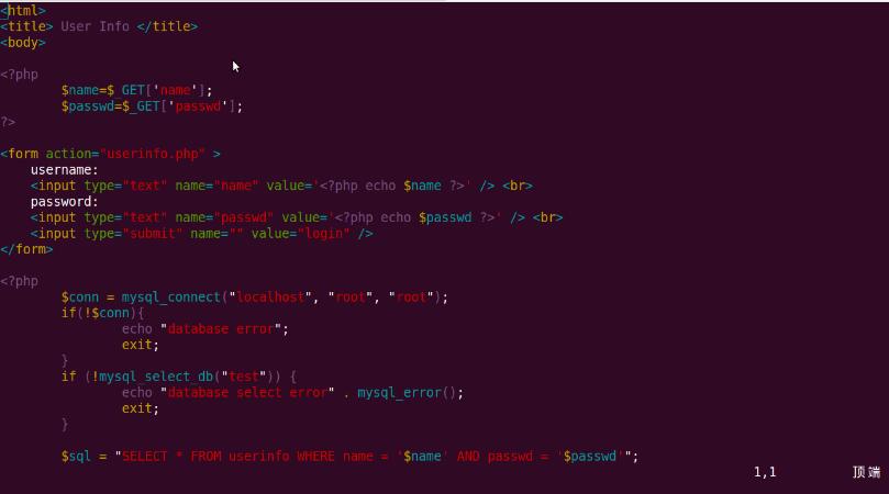 原理非常简单,通过username 和 passwd 两个文本框接受用户输入的用户名和密码,然链接数据库,