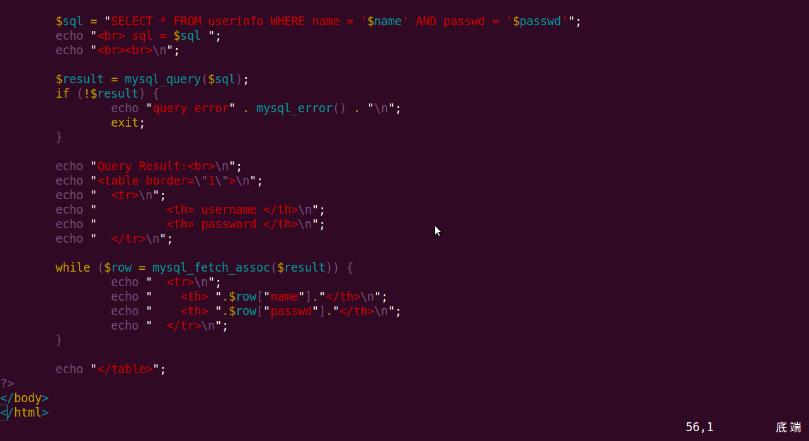 后面php服务中获取用户的输入,并保存在$name和$passwd两个变量
