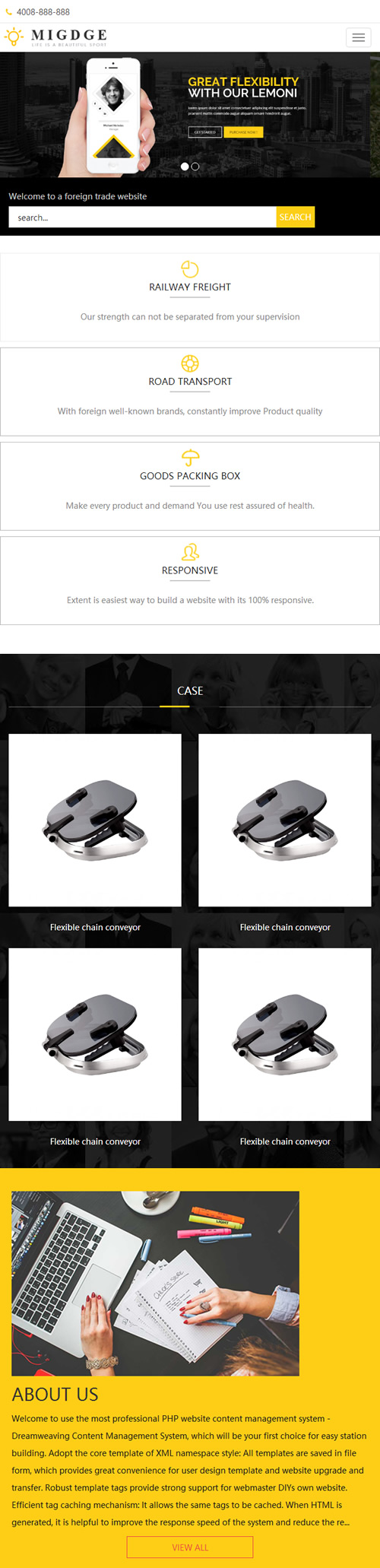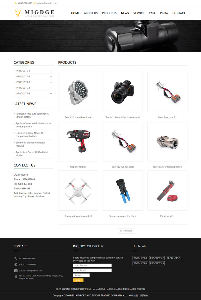 (自适应手机版)响应式五金电器出口英文外贸类网站织梦模板 HTML5五金电子产品外贸网站源码下载 本套织梦模板采用织梦最新内核开发的模板,这款模板使用范围极广,不仅仅局限于一类型的企业,五金外贸、电子产品外贸类的网站都可以用该模板。你只需要把图片和产品内容换成你的即可,颜色都可以修改,改完让你耳目一新的感觉!布局规整,利于用户体验,手工书写DIV+CSS,代码精简。 同一个后台管理 三网合一简单方便,体验极极佳! 1、该模板代码干净整洁; 2、效果相当的炫酷,相当简洁大气高端,模板简单,全部已数据调用,只需后台修改栏目名称即可 3、适用于五金外贸织梦模板、电子产品外贸网站源码; 4、网站手工DIV+css,代码精简,首页排版整洁大方、布局合理、利于SEO、图文并茂、静态HTML; 5、首页和全局重新做了全面优化,方便大家无缝使用; 6、带有XML地图,利于搜索引擎收录和排名优化源码截图: