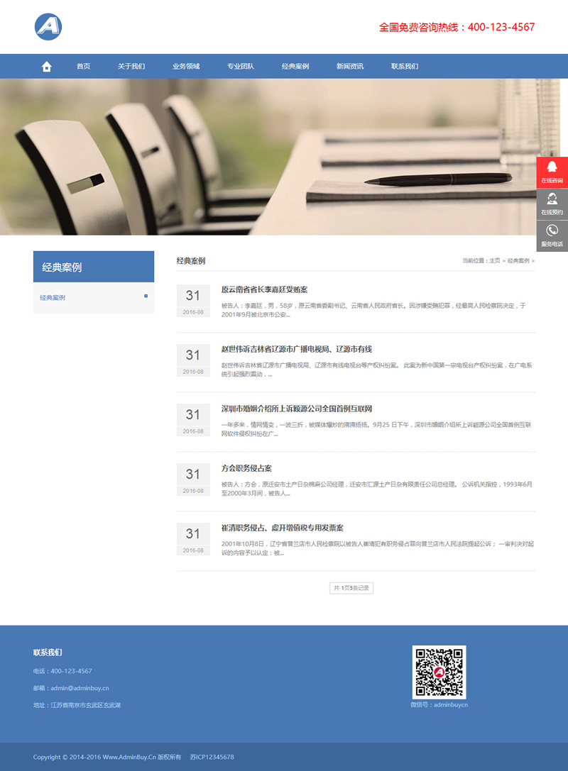 源码描述: (自适应手机版)响应式律师事务所网站织梦 模板 法律法务咨询网站源码下载 该模板是非常容易存活的,这样的网站很容易吸引访客点击,提升 流量和 是非常有利的,随便挂点联盟广告都能养活网站。 本套织梦模板采用现在非常流行的全屏自适应布局设计,且栏目列表以简洁,非常时尚大气。页面根据分辨率大小而自动排版,很大程度上改善了页面宽度兼容问题, 适应大部分显示器分辨率尺寸哦。模板整体以多种颜色为主色调,适合做各种类型的网站。 同一个后台管理三网合一简单方便,体验极佳 、该模板代码干净整洁; 、效果相当的炫