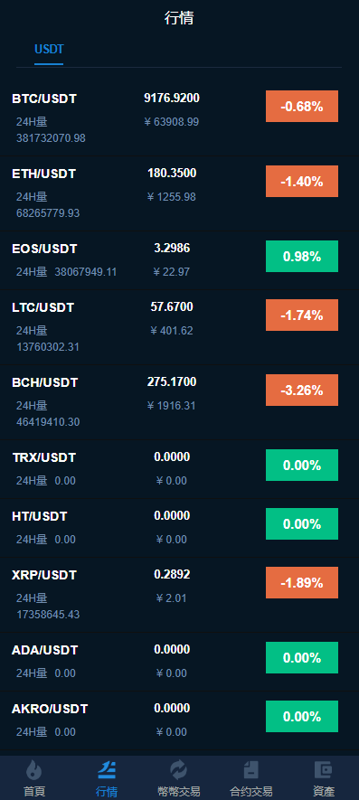 行情页面为各个交易对的行情信息,后台可调控交易对。