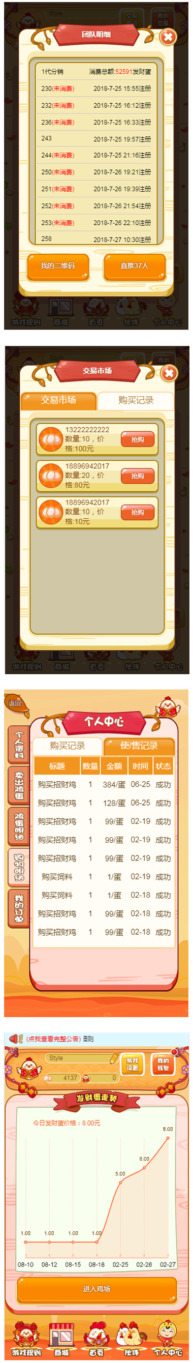 一文鸡理最新富贵鸡+发财鸡农场游戏源码理财源码一文鸡富贵鸡招财鸡农场游戏源码理财源码详细规则:1.会员加入后先购买发财蛋,99个发财蛋可以购买一只发财鸡,然后购买点击购买饲料(1个发财蛋),然后喂食发财鸡,发财鸡喂食24小时后产蛋2.24小时后需要您手动去