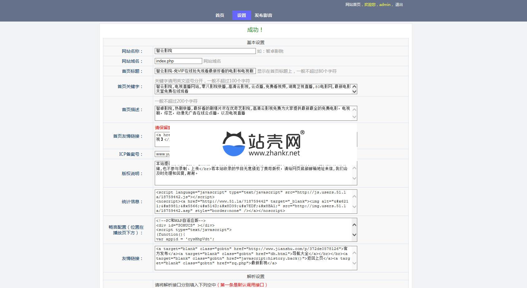 源码介绍 智云影音播放源码开源 后台默认: (文件名称可随意修改) 账号密码 (请尽快修改个人密码)默认 操作说明: 登录后台,点击设置影音进入添加或修改影音播放文件链接地址, 生成播放文件的系统在 里面 生成的文件名称请把他全部复制粘贴到增加设置影音里面 格式如 狂兽 国语中字中文版 需要增加更多,直接按照格式添加,以此类推 影音播放排行列表说明: 第一页则是最新影音展示,可随意排顺序,想展示最新靠前就把它添加在前面, 第二页到第七页操作一样,按照新旧顺序保存, 以此类推,最后的部分是展示越后面,操作简