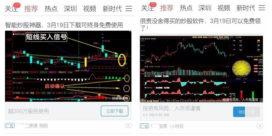 图3是今日头条信息流上的股票广告,就较好的解决了这个问题,在点击“立即下载”后,用户可以清晰地看到下载进度条,以及看到消耗的流量9.88M。