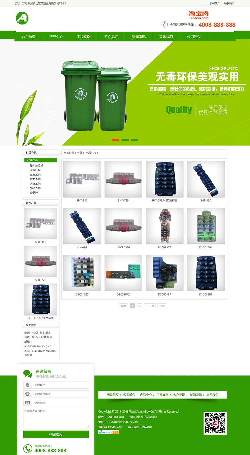 (带手机版数据同步)绿色营销型塑料制品类网站织梦模板 环保塑料垃圾桶生产企业网站源码下载 这款模板使用范围极广,不仅仅局限于一类型的企业,你只需要把图片和产品内容更换下,适用于任何行业。 本套织梦模板采用现在非常流行的全屏自适应布局设计,且栏目列表以简洁,非常时尚大气。页面根据分辨率大小而自动排版,很大程度上改善了页面宽度兼容问题, 适应大部分显示器分辨率尺寸哦。模板整体以多种颜色为主色调,适合做各种类型的网站。 同一个后台管理三网合一简单方便,体验极佳 1、该模板代码干净整洁; 2、效果相当的炫酷,相当简洁大气高端,模板简单,全部已数据调用,只需后台修改栏目名称即可 3、适用于垃圾桶网站源码、塑料制品织梦模板; 4、网站手工DIV+css,代码精简,首页排版整洁大方、布局合理、利于SEO、图文并茂、静态HTML; 5、首页和全局重新做了全面优化,方便大家无缝使用;源码截图: