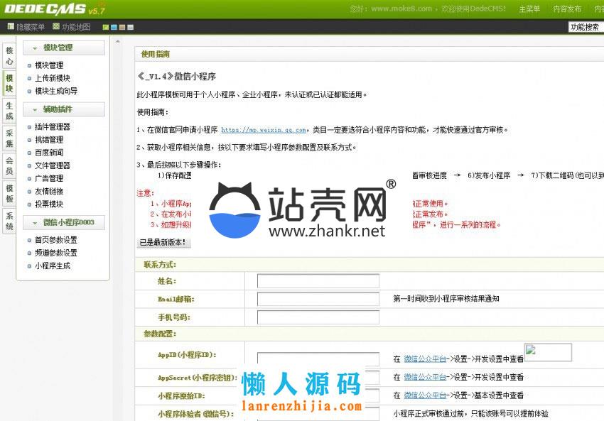 源码介绍 织梦微信小程序一键生成插件 企业 个人单页模板) 是一款便于生成微信小程序的插件,让用户更方便生成企业 个人单页小程序。 安装说明: 、登录织梦后台,找到左侧菜单 模块 上传新模块 、点击确定完成插件的上传 、点击左侧菜单 模块 模块管理 ,点击插件名称右边的 安装 、安装界面可以查看目录是否具有写入权限,需要写入权限才能保证插件的正确安装 、 对于已存在文件处理方法 ,请选择 覆盖 ,点击确定即可完成插件的安装 、安装好插件后,在 模块 辅助插件 微信小程序助手 处填写配置信息